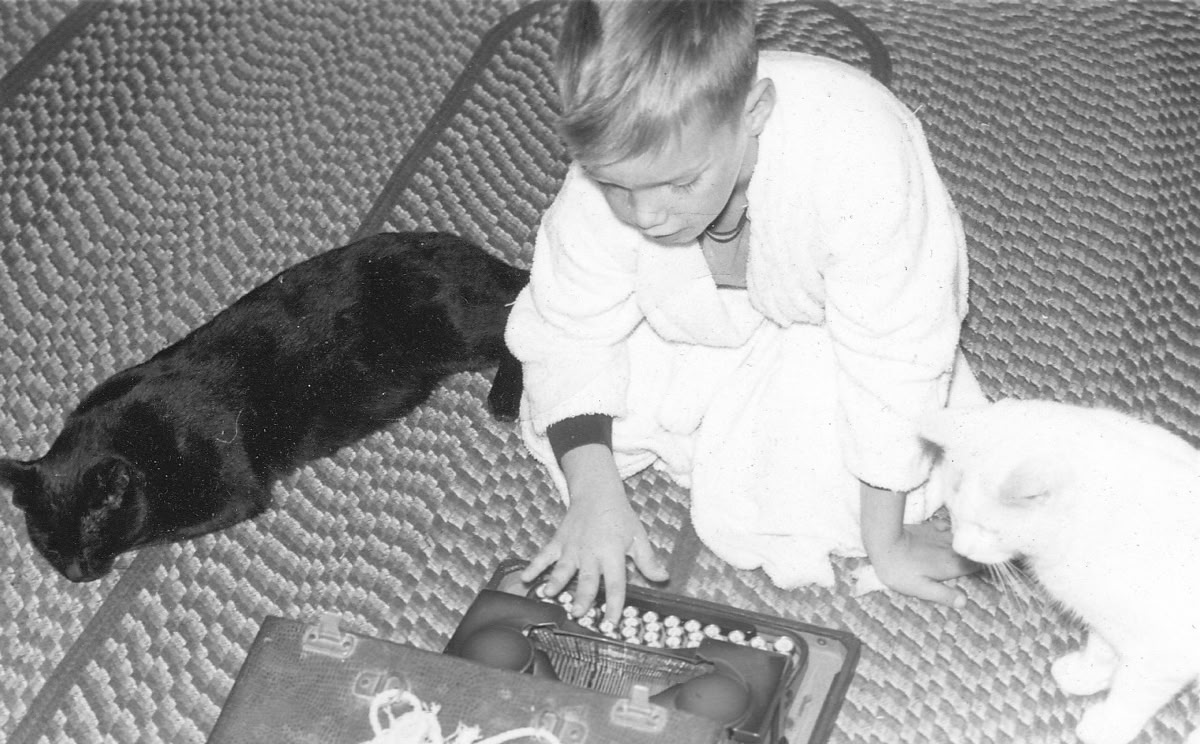 My writing career began in 1957 at age 4, assisted by my cats. Actually I’m just playing with a Royal portable typewriter, which my mother used in 1931 when she attended USC as an English major. The typewriter has since been refurbished and now serves as a conversation piece, if anyone still enjoys the art of conversation. By the way, cats will critique your work in a quiet and professional manner, unlike some editors I have known, and they don’t care what you write if you feed them on time.